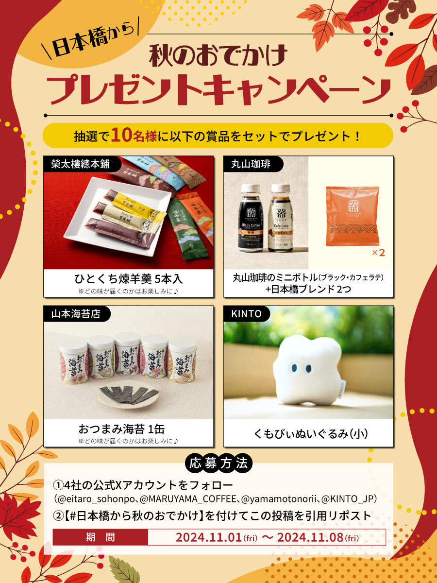 抽選で10名様に、榮太樓總本鋪「ひとくち煉羊羹5本入り」、丸山珈琲「ミニボトル+日本橋ブレンド」、山本海苔店「おつまみ海苔1缶」、KINTO「くもびぃぬいぐるみ」のセットが当たります。