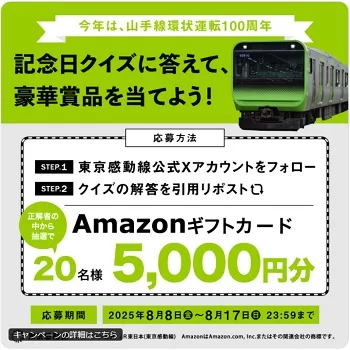 Amazonギフトカード5000円分が当たる!JR東日本・東京感動線(2025年8月17日まで)