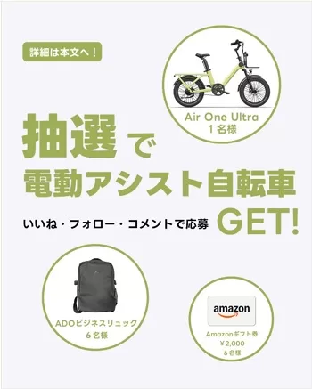 抽選で、「Air One Ultra 電動アシスト自転車」、「ADOビジネスリュック」、「Amazonギフト券 2,000円分」の賞品が当たります。