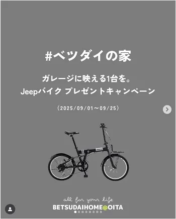 住宅会社BETSUDAI HOME(ベツダイホーム)の公式Instagramアカウント(@betsudaihome_official)にて、「ガレージに映える1台を。Jeepバイクプレゼントキャンペーン」が実施されています。