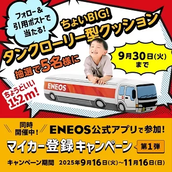 ちょいBIG!タンクローリー型クッションが当たる!ENEOS公式アプリ(2025年9月30日まで)