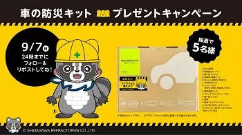 総合耐火物メーカー「品川リフラクトリーズ」のコーポレートキャラクター「リフラくん」のXアカウント(@refraccoon)にて、車の防災キット️プレゼントキャンペーンを実施しています。