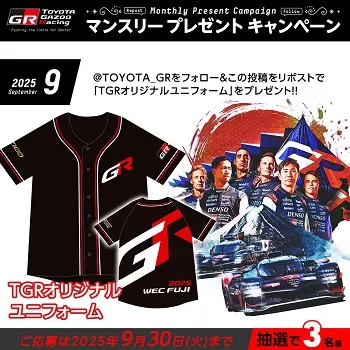 2025年9月は、抽選で3名様に「TGRオリジナルユニフォーム」が当たります。
