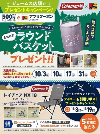 カー用品店・ジェームスのXアカウント(@jms_car_item)にて、コールマン×ジェームス キャンペーンが実施されています。