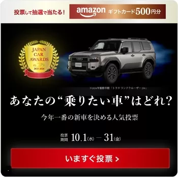 アップガレージにて実施されている、ユーザー投票でその年でNo.1の新車を決める大会 『JAPAN CAR AWARDS』の投票をした方から期間中抽選で毎日3名様に、Amazonギフトカード500円分が当たります。