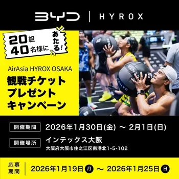 BYD Auto Japanにて、「AirAsia HYROX 大阪 観戦チケットプレゼント キャンペーン」が実施されています。