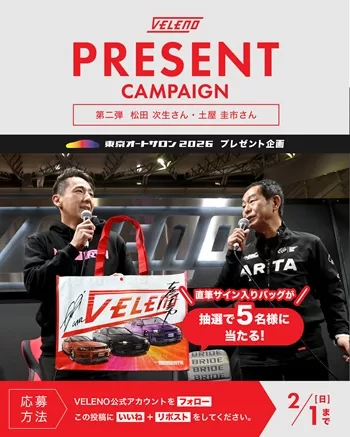VELENOのXアカウント(@VELENO_REIZ)にて、「東京オートサロン2026 出店記念・感謝プレゼントキャンペーン」を実施しています。