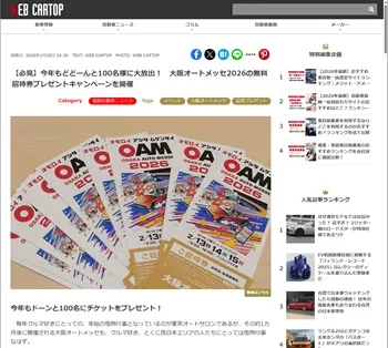 自動車情報・ニュース WEB CARTOPにて、「大阪オートメッセ2026の無料招待券プレゼントキャンペーン」を実施しています。