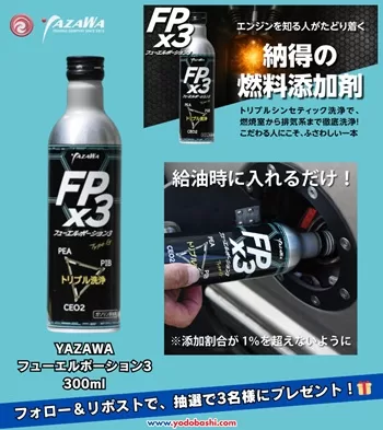 ・抽選で3名様に、「燃料添加剤 YAZAWA フューエルポーション3 300ml」をプレゼント