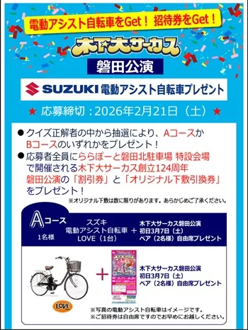 ・A賞:スズキ 電動アシスト自転車 LOVE(1台) + 木下大サーカス磐田公演初日 3月7日(土) ペア(2名様)自由席:1名様