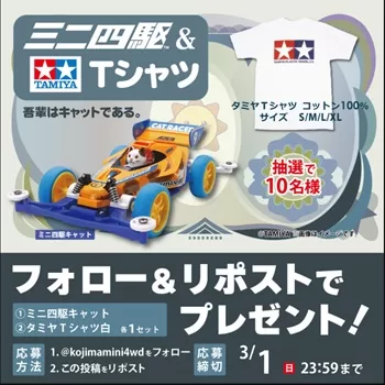 ミニ四駆キャット+タミヤTシャツのセットが当たる!コジマミニ四駆倶楽部(2026年3月1日まで)