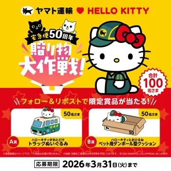ヤマト運輸 「ハローキティがおとどけ トラックぬいぐるみ」、「ハローキティとおひるね ペット用ダンボール型クッション」が当たる!(2026年3月31日まで)