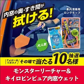 抽選で10名様に、車内清掃用ロングモップ「モンスターリーチャー」&「キイロビンピュアウェット」が当たります。