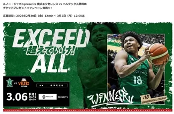 抽選でペア25組・50名様に、2026年3月6日(金)横浜武道館でのプロバスケットボール「Bリーグ 横浜エクセレンス vs ベルテックス静岡戦」観戦チケットが当たります。