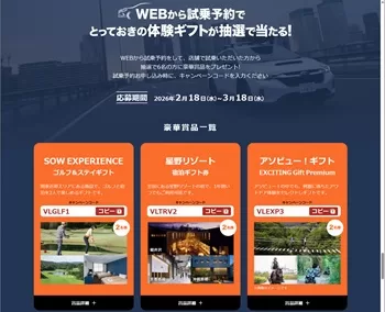 スバル(SUBARU)にて、「 WEBから試乗予約でとっておきの体験ギフトが抽選で当たる!」キャンペーンを実施しています。