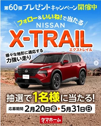 タマホームの公式Instagramにて実施されているプレゼントキャンペーン第60弾にて、日産自動車 エクストレイル X e-4ORCE [2列](4WD)が抽選で1名様に当たります。