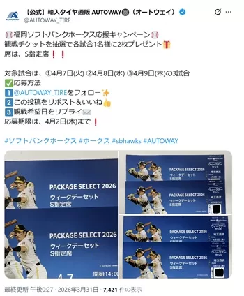 輸入タイヤ通販 AUTOWAYのXアカウント(@AUTOWAY_TIRE) にて、「福岡ソフトバンクホークス応援キャンペーン」が実施されています。