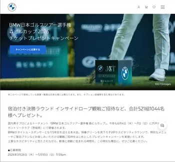 BMW Japanにて、「BMW 日本ゴルフツアー選手権 森ビルカップ 2026 チケットプレゼントキャンペーン」が実施されています。