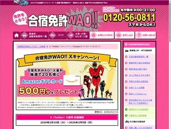 【キャンペーンサイト】X(Twitter)キャンペーン!Amazonギフトカードプレゼント![合宿免許WAO!!(ワオ)]