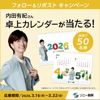 ソニー損保の自動車保険のXアカウント(@sonysonpo_jp)にて、「内田有紀さん卓上カレンダーが当たる!フォロー&リポストキャンペーン」が実施されています。