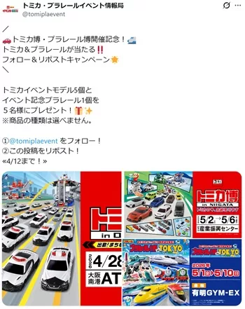 トミカ・プラレールイベント情報局のXアカウント(@tomiplaevent)にて、プレゼントキャンペーンを実施しています。