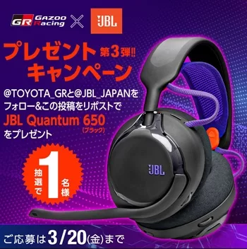 TOYOTA GAZOO Racingの公式Xアカウント(@TOYOTA_GR)にて、「GAZOO Racing x JBL プレゼントキャンペーン第3弾」が実施されています。