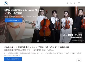 BMW Japanにて、「BMW BELIEVES in Arts and Music ほのカルテット 弦楽四重奏コンサート ご招待キャンペーン」が実施されています。
