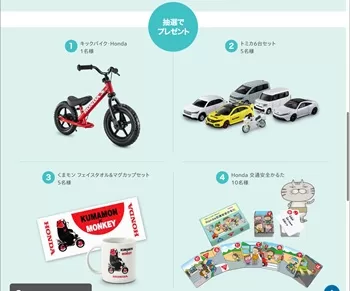 さらに抽選で21名の方に、キックバイクやトミカ6台セットなどのHondaグッズが当たります。