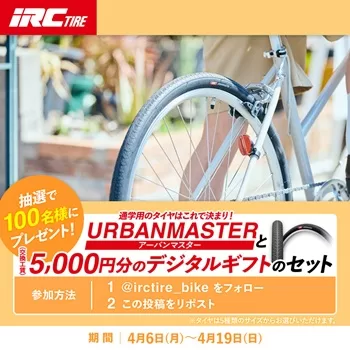 抽選で100名様に、「iRC自転車用タイヤ「アーバンマスター」と5,000円分のデジタルギフトのセット」が当たります。