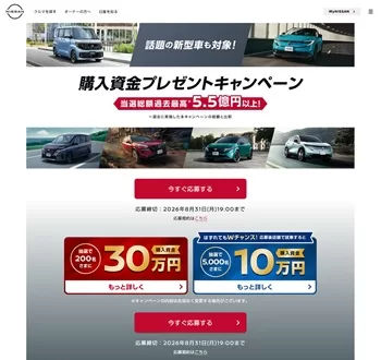 [前回]:日産 新車購入支援金30万円、10万円分が当たる!新型ルークス・新型日産リーフ誕生記念!購入支援金プレゼントキャンペーン(2026年2月2日まで)