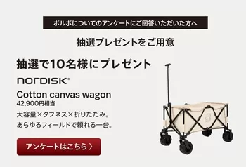 その中の、ボルボ アンケートキャンペーンで、アンケートに回答した方の中から抽選で10名様に、「Nordisk Cotton canvas wagon」が当たります。