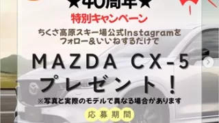 車両本体 マツダ CX-5が当たる!ちくさ高原スキー場 Instagram(2026年3月8日17:00まで) ちくさ高原スキー場のInstagramにて、40周年特別キャンペーンが実施されています。抽選で1名様に、「マツダ CX-5」が当たります。<賞品>マツダ MAZDA CX-5(新車):1名様協賛:神戸マツダ 提供:神戸マツダ神戸本店※車両の... 2025.12.18 2026年03月締め切りマツダ車両本体