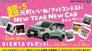 車両本体 トヨタ シエンタが当たる!横浜元町ショッピングストリート 超×5☆元町いいね!フォトコンテスト NEWYEAR NEWCAR キャンペーン(2026年1月31日まで) 横浜元町ショッピングストリートの「超×5☆元町いいね!フォトコンテスト NEWYEAR NEWCAR キャンペーン」にて、トヨタ シエンタが抽選で1名様に当たります。横浜元町ショッピングストリートでは、2025-26年もトヨタ シエンタが当... 2025.12.27 2026年01月締め切りトヨタ車両本体