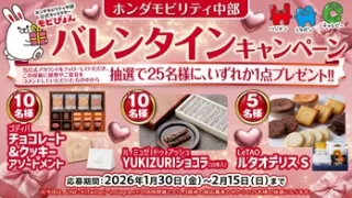 New! 2026年02月締め切り ゴディバ、ル ミュゼ ドゥ アッシュ、ルタオのチョコレートスイーツが当たる!ホンダモビリティ中部(2026年2月15日まで) ホンダモビリティ中部のSNSアカウント(X・Instagram・公式LINE)にて、「バレンタインキャンペーン」が実施されています。抽選で計25名様に、「ゴディバ チョコレート&クッキー アソートメント」、「ル ミュゼ ドゥ アッシュ YU... 2026.01.30 2026年02月締め切りホンダ