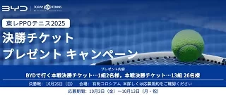 過去の懸賞情報 BYDで行く「東レPPOテニス2025決勝」観戦チケットが当たる!(2025年10月13日まで)