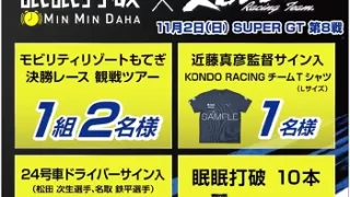 過去の懸賞情報 SUPER GT 第8戦観戦ツアーや近藤真彦監督、24号車ドライバーサイン入りグッズなどが当たる!眠眠打破(2025年10月12日まで)